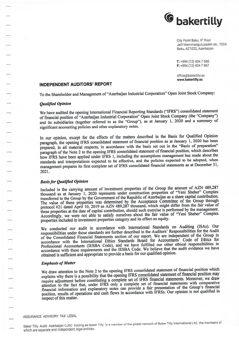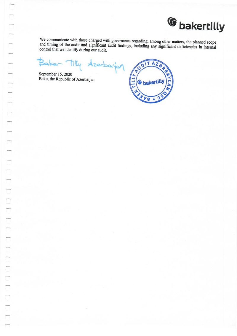 Maliyyə göstəricilərinə müsbət rəyi “Baker Tilly Audit Azərbaycan” şirkəti tərəfindən 15 Sentyabr 2020-ci il tarixində verilib.