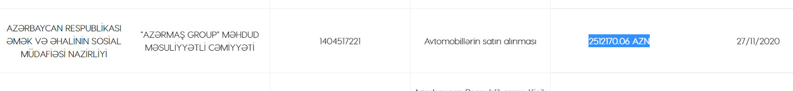 NAzirlik qalib şirkət ilə məbləği 2 milyon 512,2 min manat (hər avtomobil üçün orta hesabla 12,2 min manat) olan müqavilə bağlayıb.