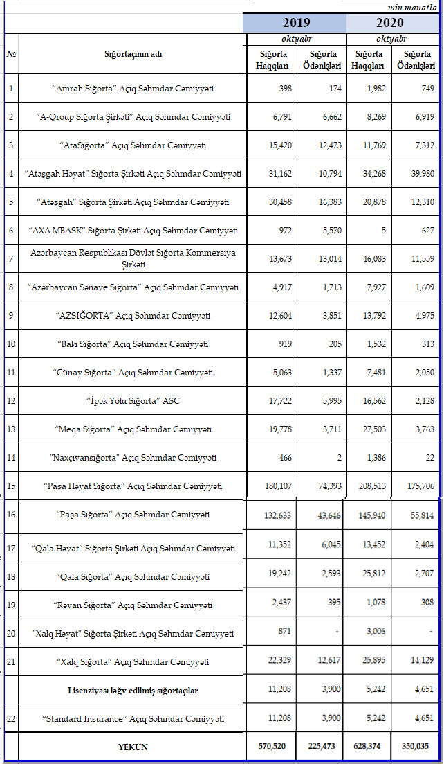 2020-ci ilin 10 ayı ərzində sığorta şirkətlərinin hesabladıqları sığorta haqları və sığorta ödənişləri açıqlanıb.