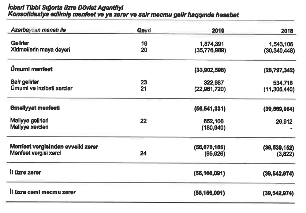İcbari Tibbi Sığorta üzrə Dövlət Agentliyi 2019-cu ili 56 milyon 166 min manat xalis zərərlə başa vurub.