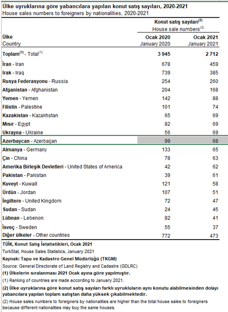 Azərbaycanlılar Türkiyədə 2016-da 610 mənzil, 2017-ci ildə 942 mənzil, 2018-ci ildə 1250 mənzil, 2019-cu ildə 1191 mənzil, 2020-ci ildə 1279 mənzil alıblar.