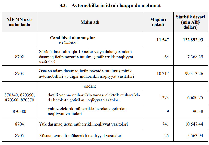 Xəbər verdiyimiz kimi, 2021-ci ilin yanvar ayında Azərbaycana 53 milyon 445 min dollar dəyərində 4 min 642 ədəd avtomobil idxal edilmişdir. Avtomobil idxalı 2020-ci ilin Yanvar ayı ilə müqayisədə 21,4% və ya 1264 ədəd azalmışdır.