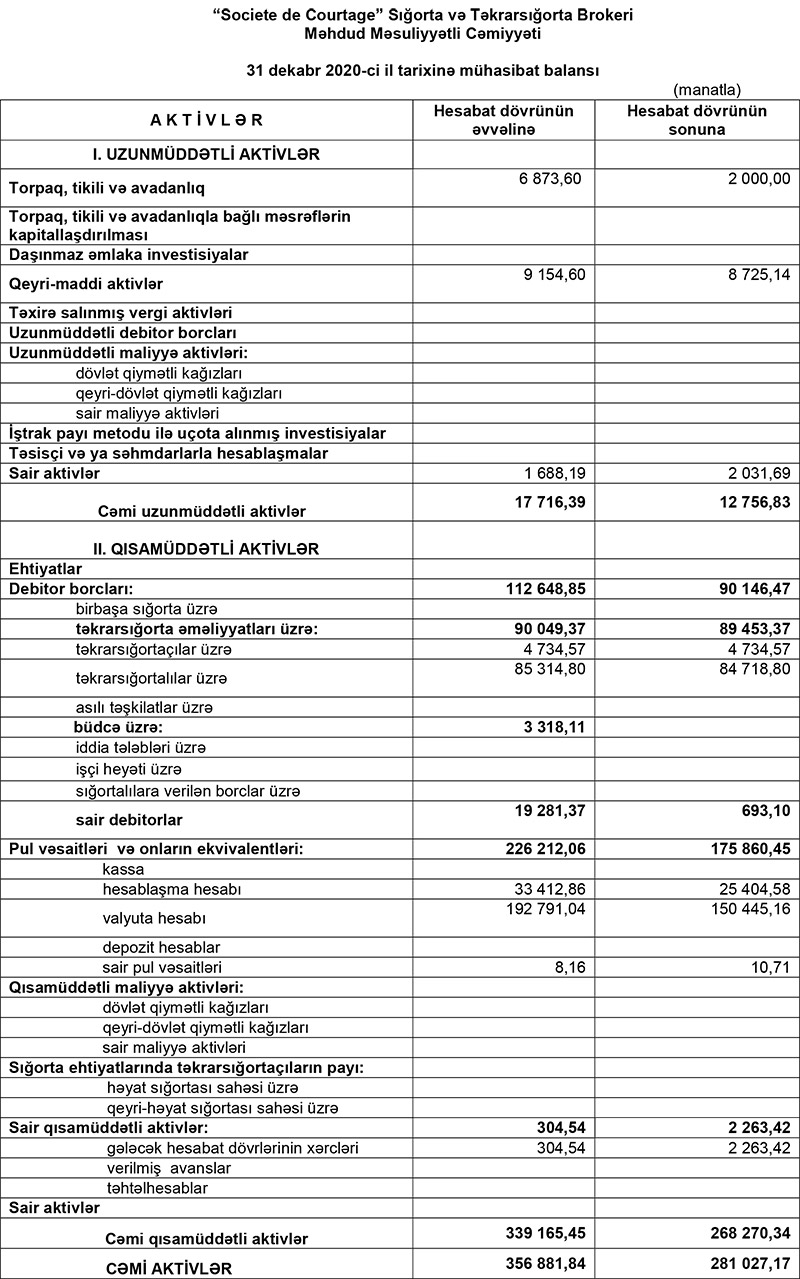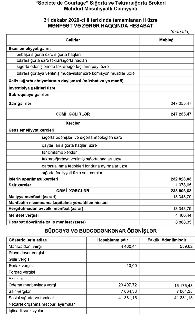 “Societe de Courtage” Sığorta və Təkrarsığorta Brokeri MMC 2020-ci ili 8 min 888 manat xalis mənfəət ilə başa vurub. “Şirkət 2019-cu ili 1903 manat zərər ilə bağlamışdı.