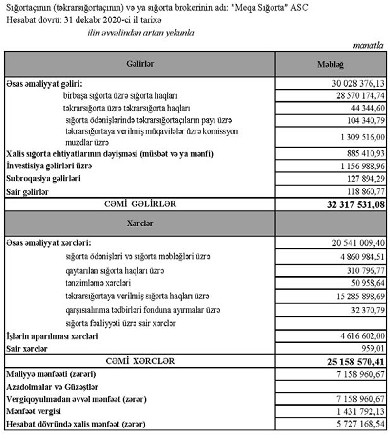 “Meqa Sığorta” ASC 2020-ci ili 5 milyon 727 min manat xalis mənfəət ilə başa vurub. Halbuki, şirkət 2019-cu ili 3 milyon 533 min manat xalis mənfəət ilə bağlamışdı.