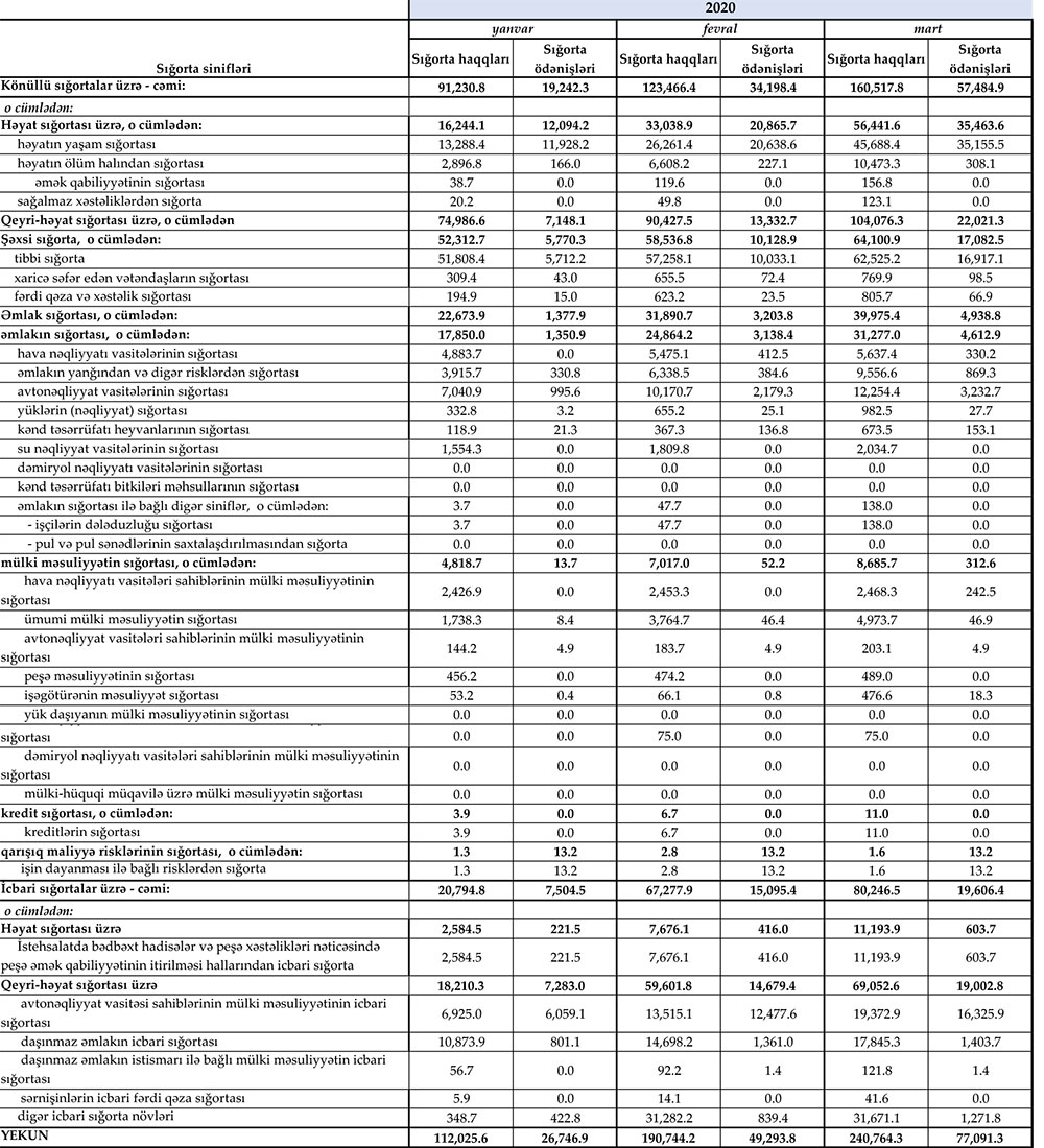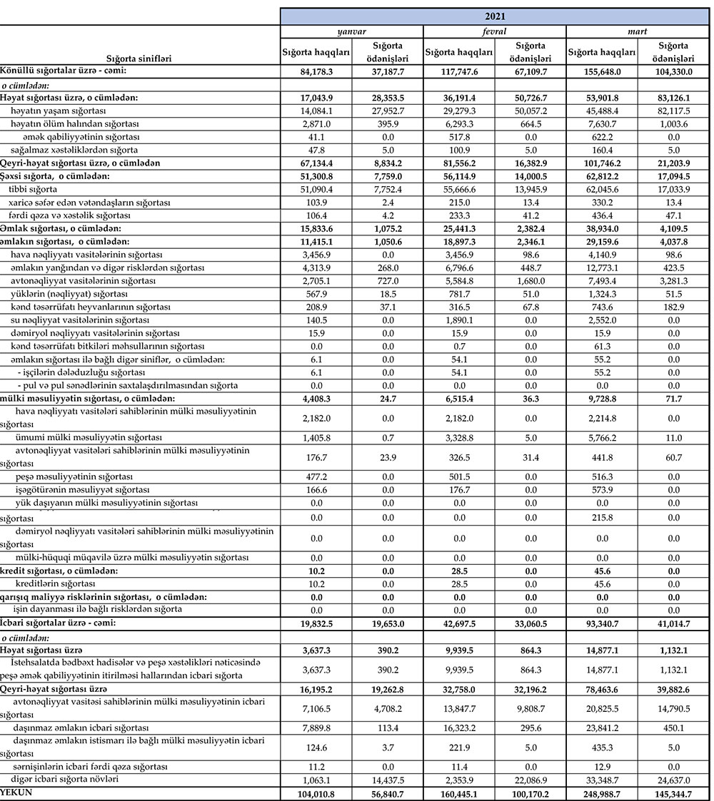 2021-in ilk 3 ayında sığorta haqları və sığorta ödənişləri