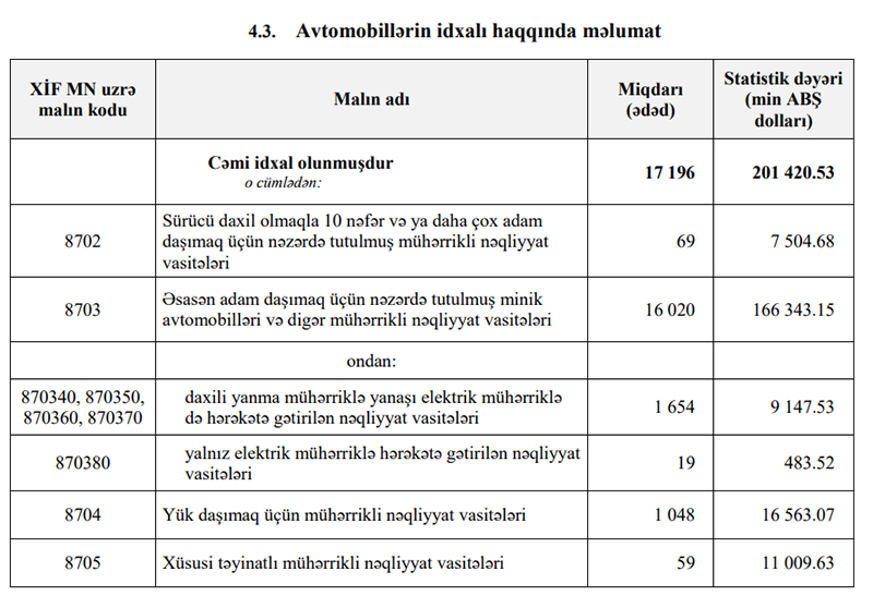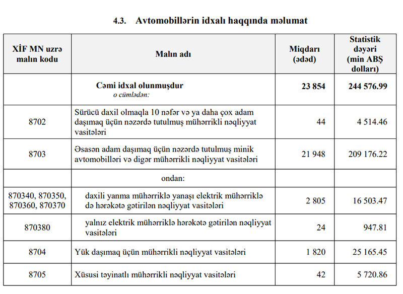 Qeyd edək ki, 2020-ci ilin yanvar-aprel aylarında Azərbaycana 201 milyon 420 min dollar dəyərində 17 min 196 ədəd avtomobil idxal edilmişdi.