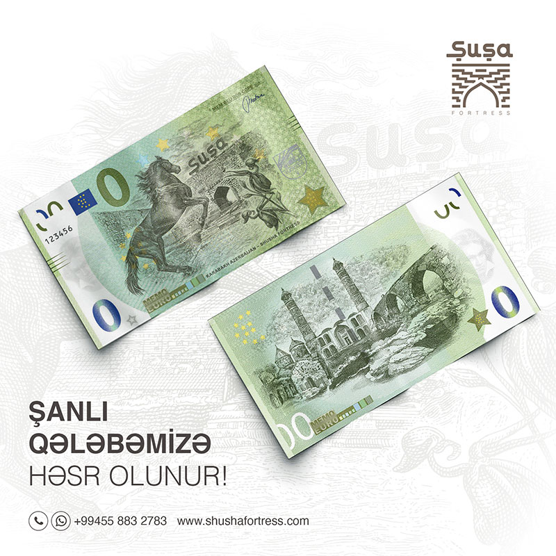 Qeyd edək ki, 44 günlük zəfər tarixinə və Qarabağa həsr olunan 0 avro banknotları artıq satışa da çıxarılıb. Məhdud sayda çap olunan hədiyyəlik əsginasları www.shushafortress.com saytından sifariş etmək mümkündür.