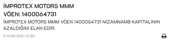 "Improtex Group" MMC-yə daxil olan "Improtex Motors" MMC nizamnamə kapitalını azaltdığını elan edib.
