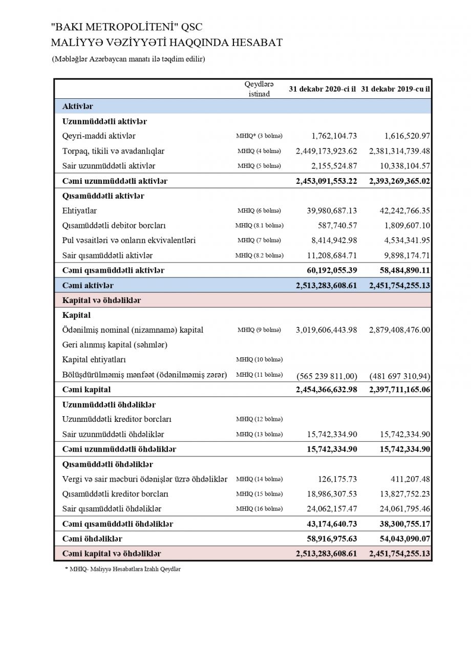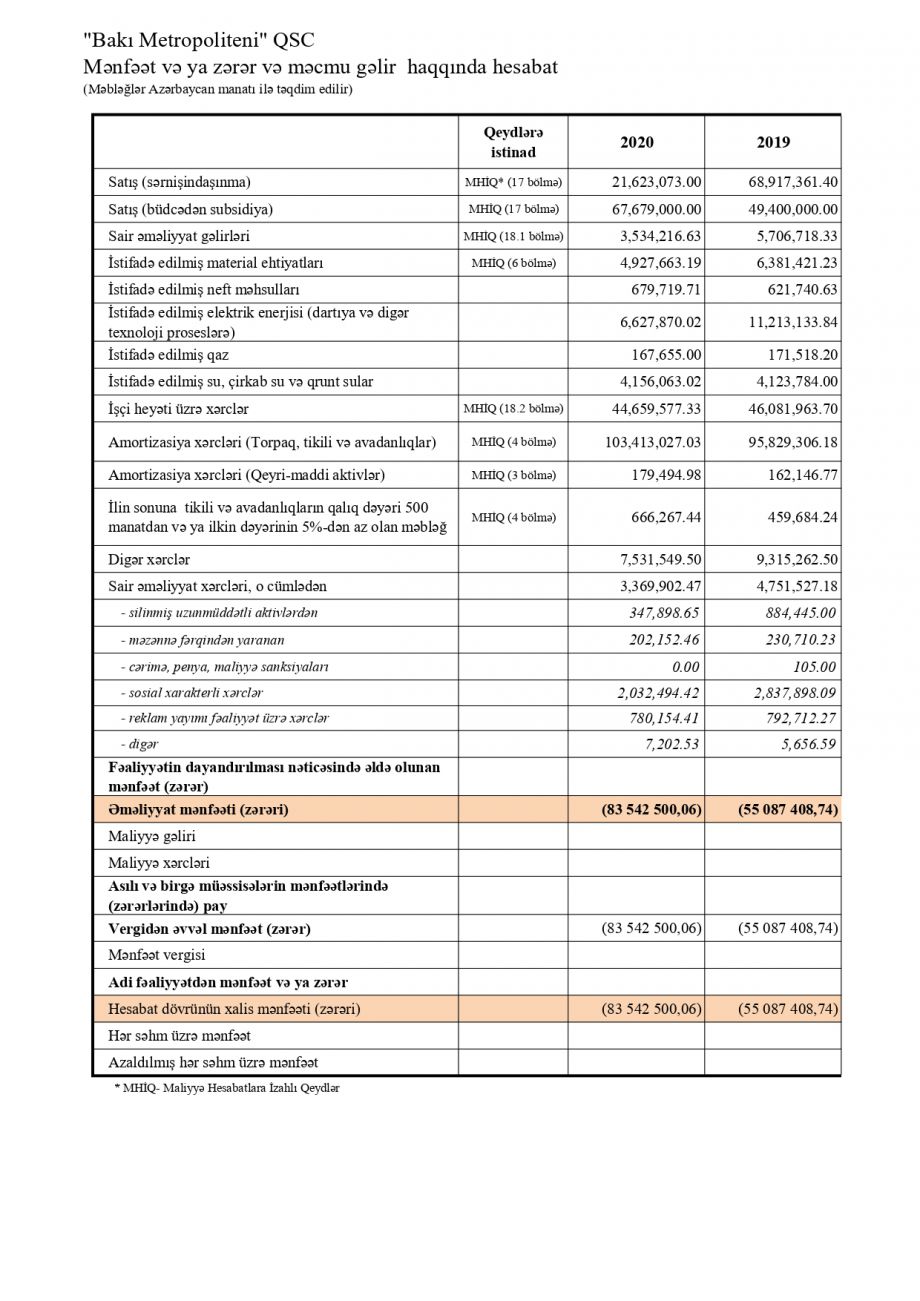 Bir sıra xərclər sabit olduğundan "Bakı Metropoliteni"nin xalis zərəri artıb. 2019-cu ildə 55 milyon 87 min manat təşkil etmiş xalis zərər 2020-ci ildə 83 milyon 542 min manata yüksəlib.