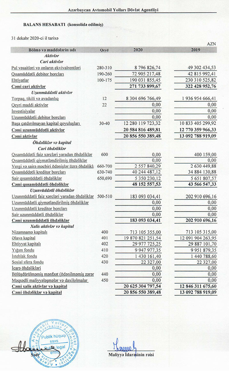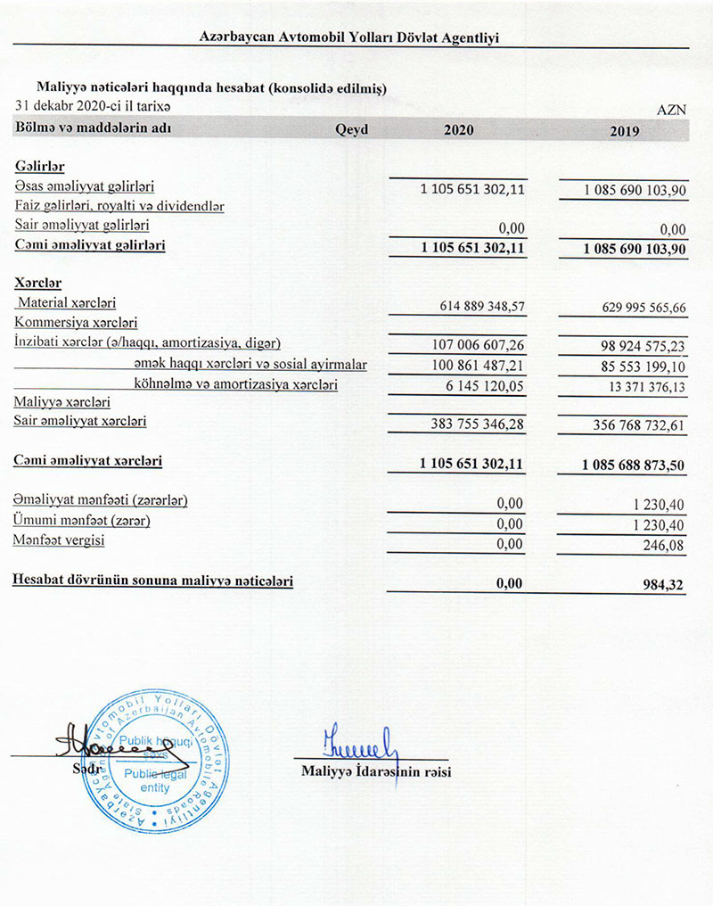 2020-ci ildə Azərbaycan Avtomobil Yolları Dövlət Agentliyinin gəlir və xərcləri eyni səviyyədə olub.