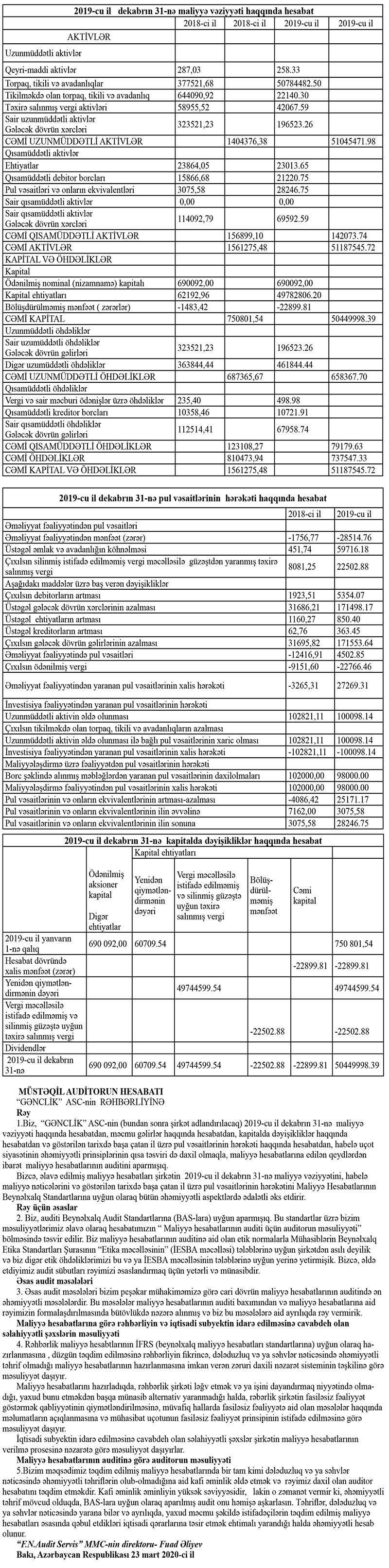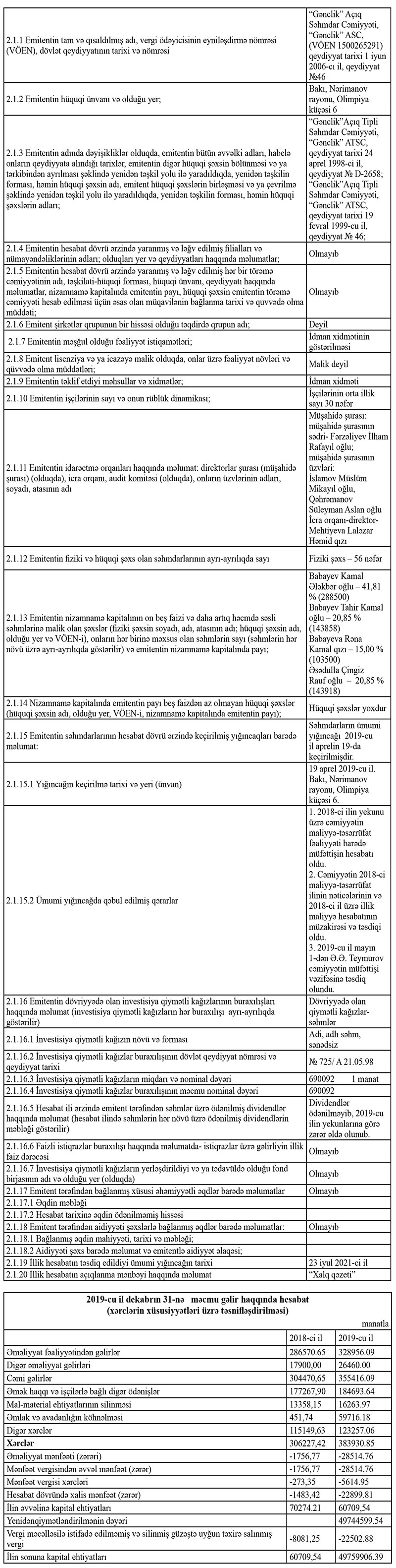 İdman xidmətləri göstərən "Gənclik" ASC 2020-ci ili 83 min 566 manat xalis zərər ilə başa vurub. Bu, 2019-cu illə müqayisədə 3,6 dəfə çoxdur. ASC 2019-cu ili 22 min 900 manat zərər ilə bağlamışdı.