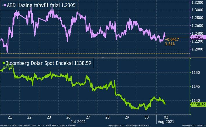 Dollar/TL məzənnəsinin düşməsinə ABŞ xəzinə istiqrazı faizi və zəifləyən dollar da təsir edib. 10 illik ABŞ Xəzinə istiqrazının faizi 1,22% səviyyəsinə qədər geriləyib, ABŞ valyutasının mühüm pul vahidləri qarşısındakı performansını göstərən Bloomberg Dollar Spot İndeksi 1138-ə düşüb.