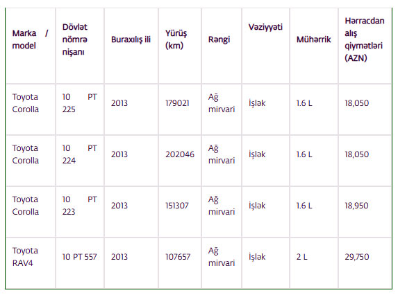 Bank işlənmiş avtomobillərini satır - SİYAHI, QİYMƏTLƏR