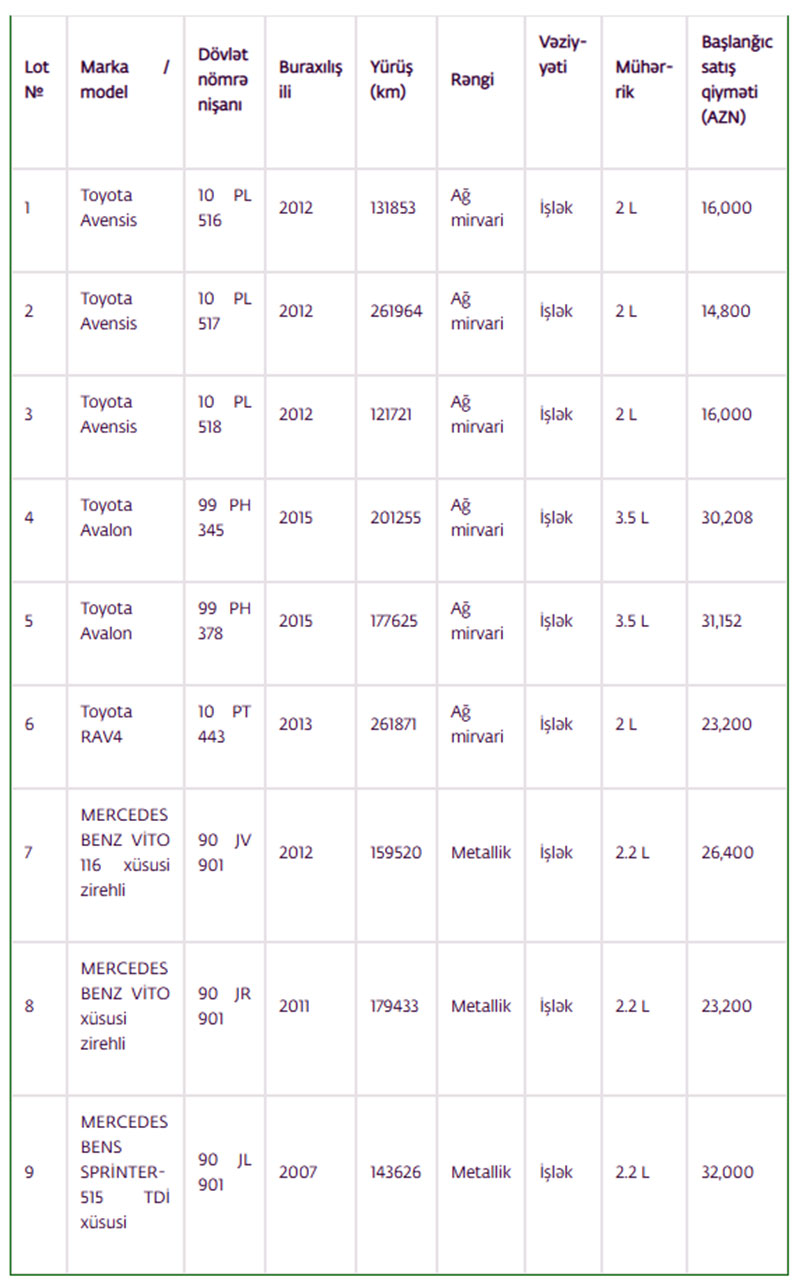 Hərraca çıxarılmış avtomobillərin siyahısı: