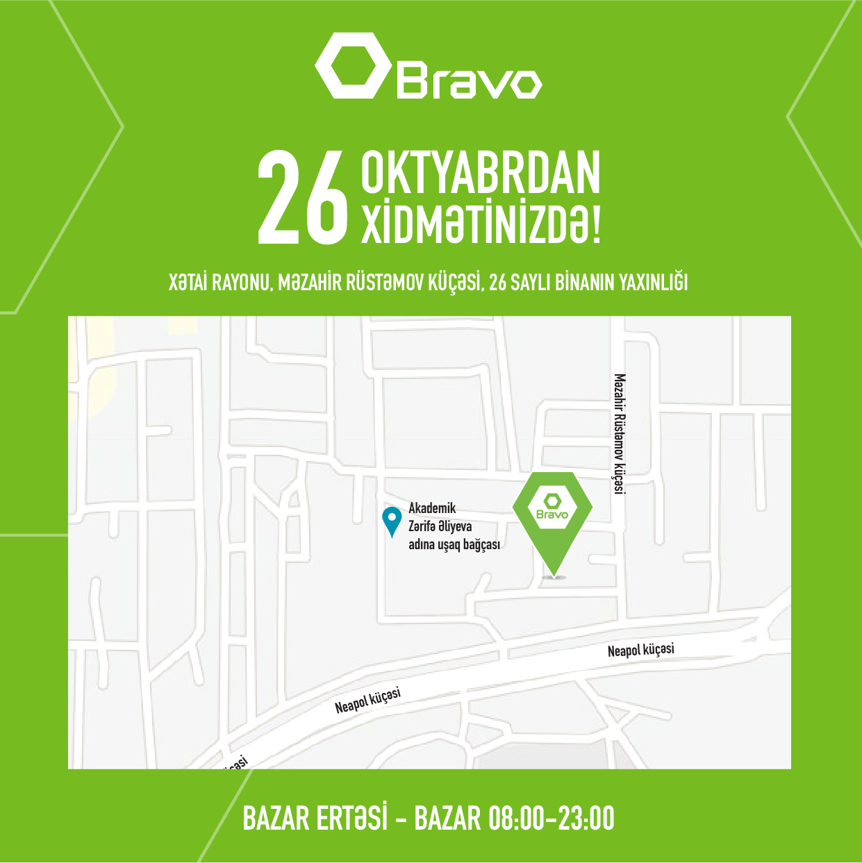 Yeni BRAVO marketləri - Z.Bünyadov pr. 1965-ci məhəllə, "Çinar Park" biznes mərkəzində, Nərimanov r-nu, Ə.Əliyev küç. 65, 1990-cı məhəllədə və Xətai rayonu, Məzahir Rüstəmov küç., 26 saylı binanın yaxınlığında istifadəyə veriləcəkdir.