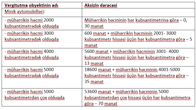 Mühərrikinin həcmi 3000 kubsantimetrdən çox və istehsal tarixi 3 ildən artıq olan minik avtomobillərinə görə aksiz dərəcələri artırılır.