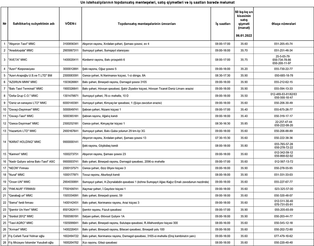 Dövlət Xidmətinin yaydığı məlumatda bildirilir ki, aşağıdakı cədvəldə qeyd edilən topdansatış məntəqələrində hazırda unun 50 kq-lıq kisələrdə topdansatış qiyməti 35,2-35,9 manat təşkil edir. İstehsalçılar topdansatış məntəqələrində biznes subyektlərinə unun göstərilən qiymətə satılmasını təmin edəcəklər.