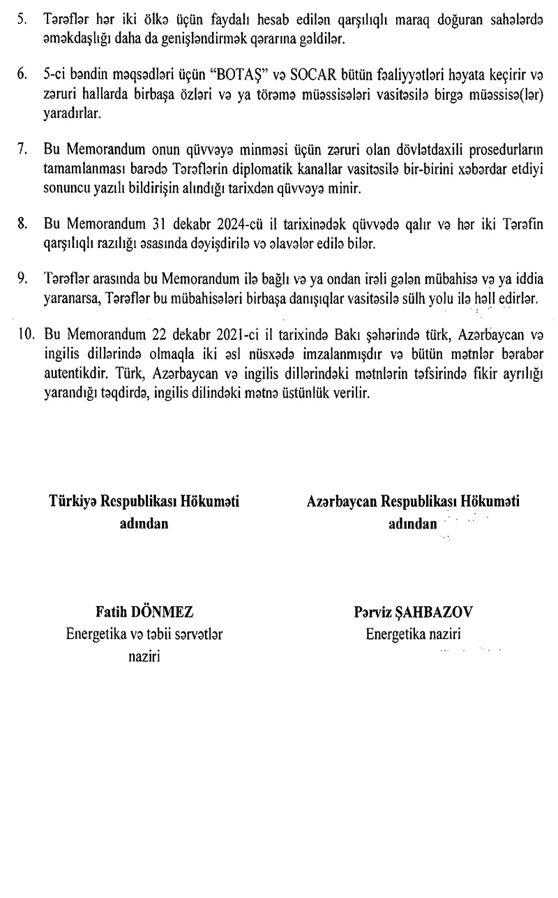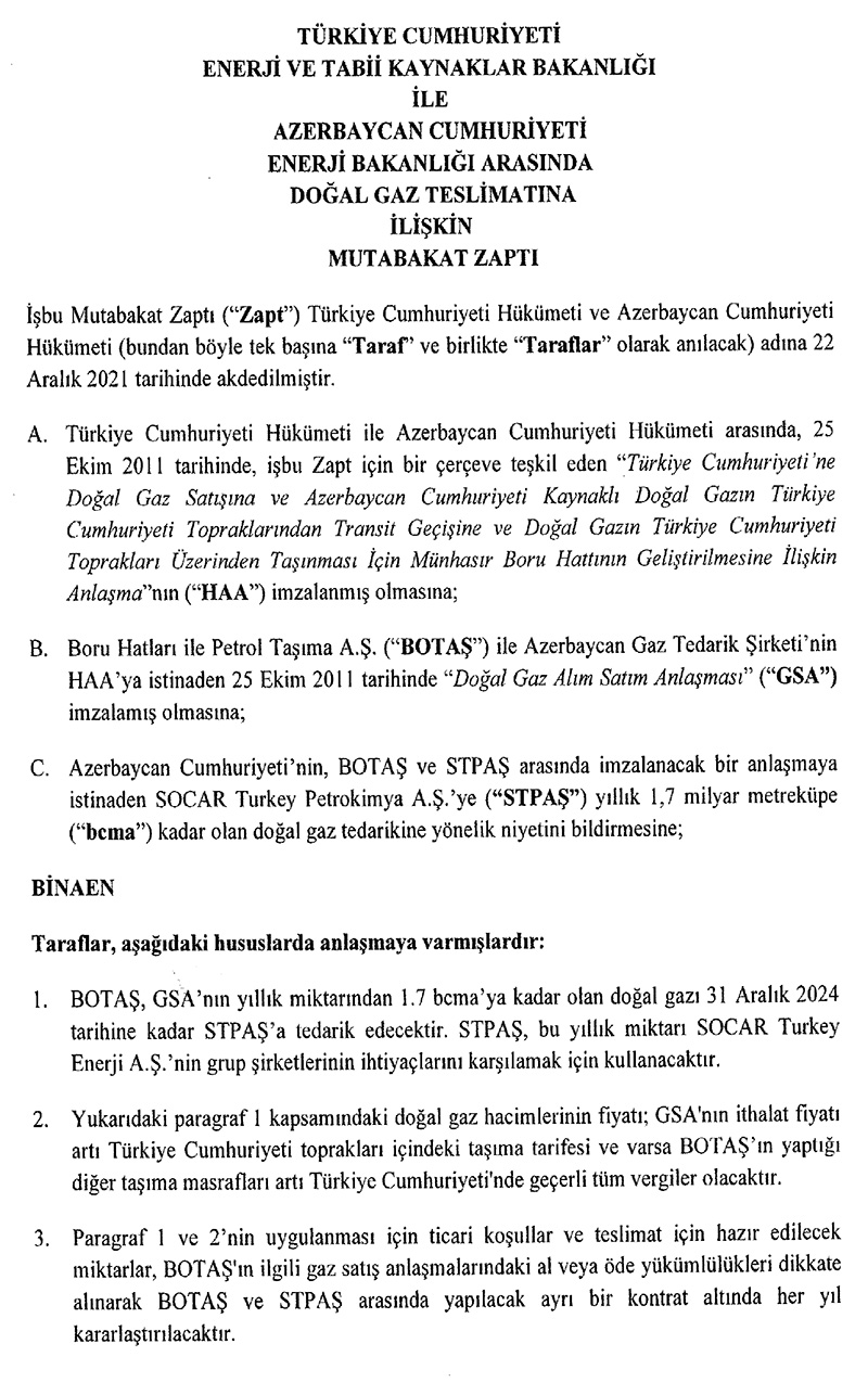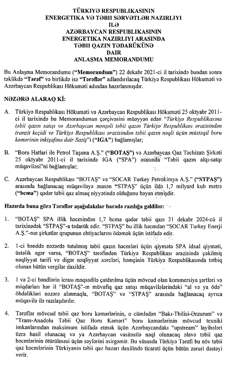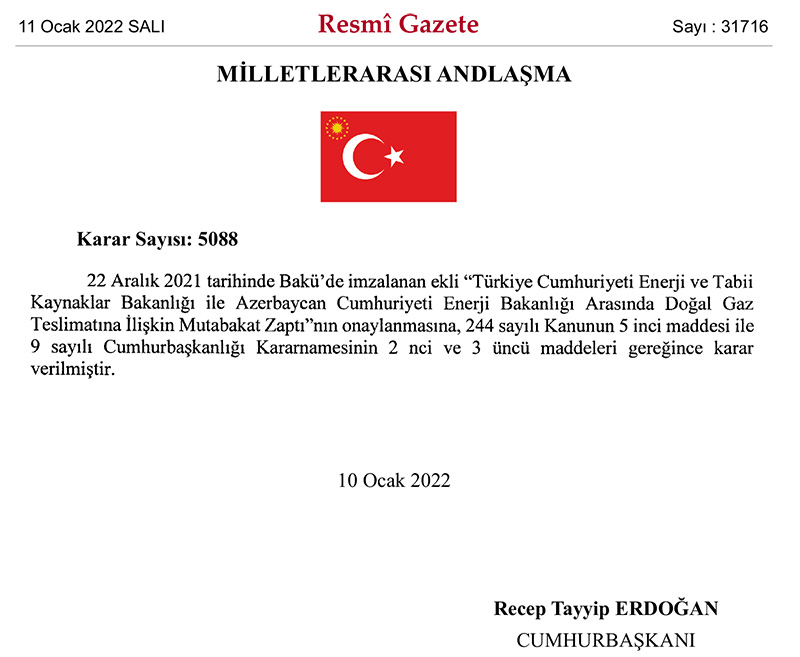 Dekabrda Türkiyə ilə Azərbaycan arasında imzalanmış təbii qazın tədarükünə dair anlaşma memorandumu Türkiyə Prezident tərəfindən təsdiq edilib.