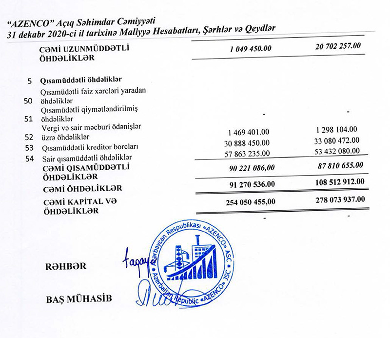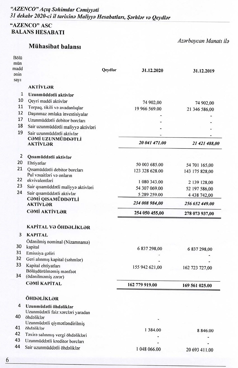 “Azenko” ASC 2020-ci ilin sonunda 254 milyon 50 min manat cəmi aktivlərə malik olub. 2019-cu ilin sonunda şirkətin cəmi aktivləri 278 milyon 74 min manat təşkil etmişdi.