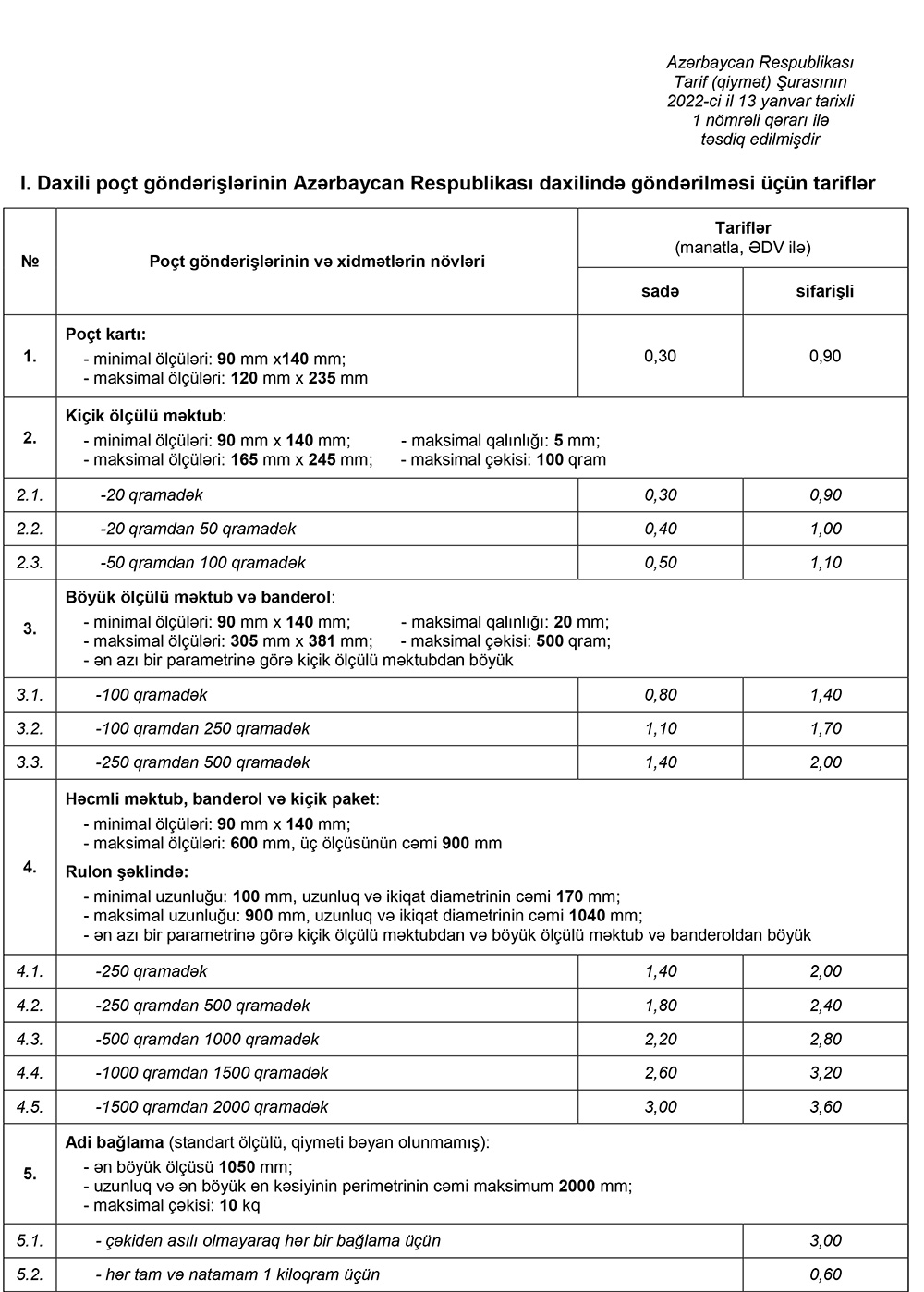 Tarif Şurası üzvlərinin yekdil qərarı ilə universal poçt rabitəsi xidmətindən istifadə tarifləri təsdiq edilib.