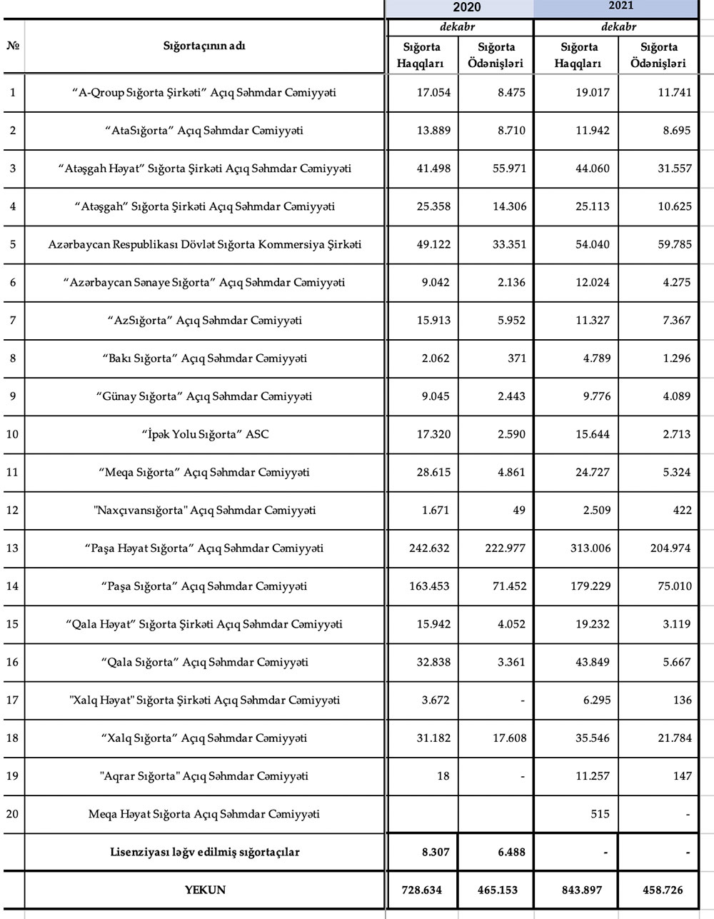Sığorta şirkətlərinin 2021-ci ildəki yığımları və ödənişləri açıqlandı - SİYAHI