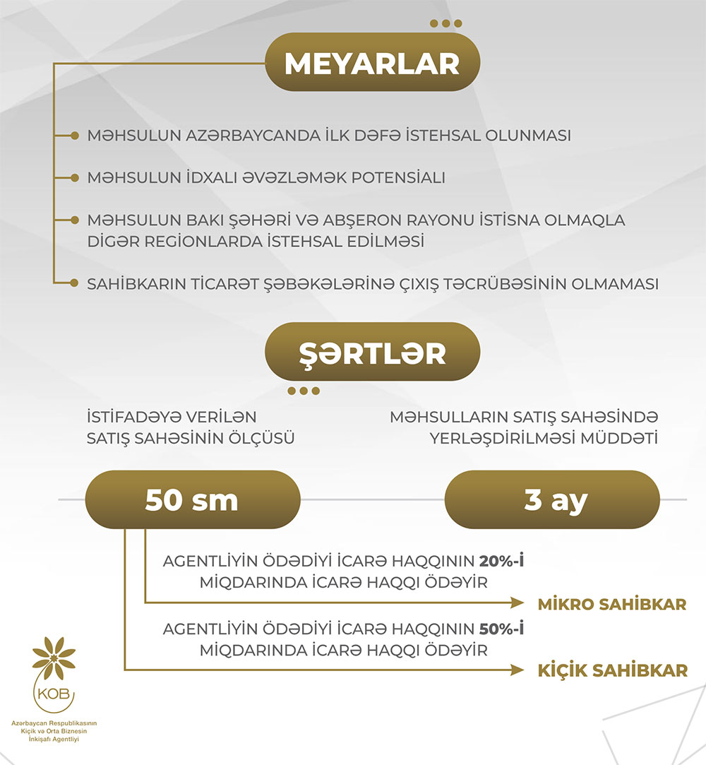 Dəstəkdən mikro və kiçik sahibkarlar istifadə edə bilərlər. Bu dəstək çərçivəsində ticarət obyektində sahibkarın istifadəsinə veriləcək satış yerinin ölçüsü 50 sm, məhsulların satış sahəsində yerləşdirilməsi müddəti isə 3 aydır. Mikro sahibkarlıq subyekti onun istifadəsinə verilən satış sahəsinə görə icarə haqqının 20%-ni, kiçik sahibkarlıq subyekti isə 50%-ni ödəyəcəkdir.