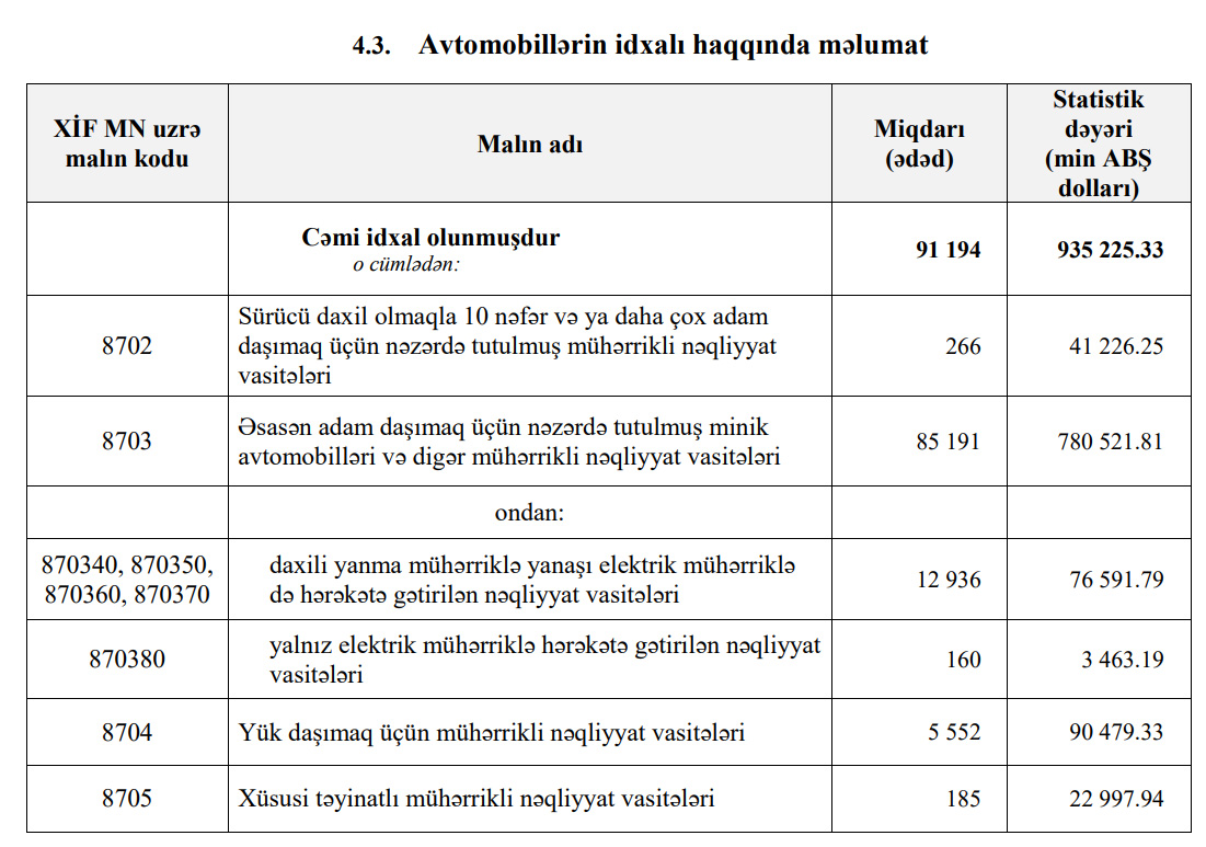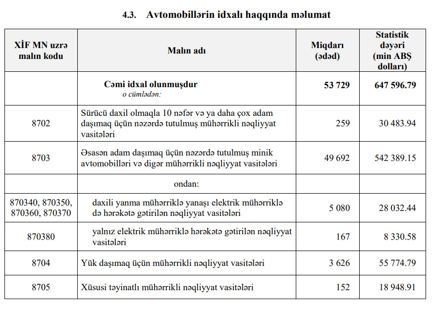 Qeyd edək ki, 2020-ci ildə Azərbaycana 647 milyon 597 min dollar dəyərində 53 min 729 ədəd avtomobil idxal edilmişdi.