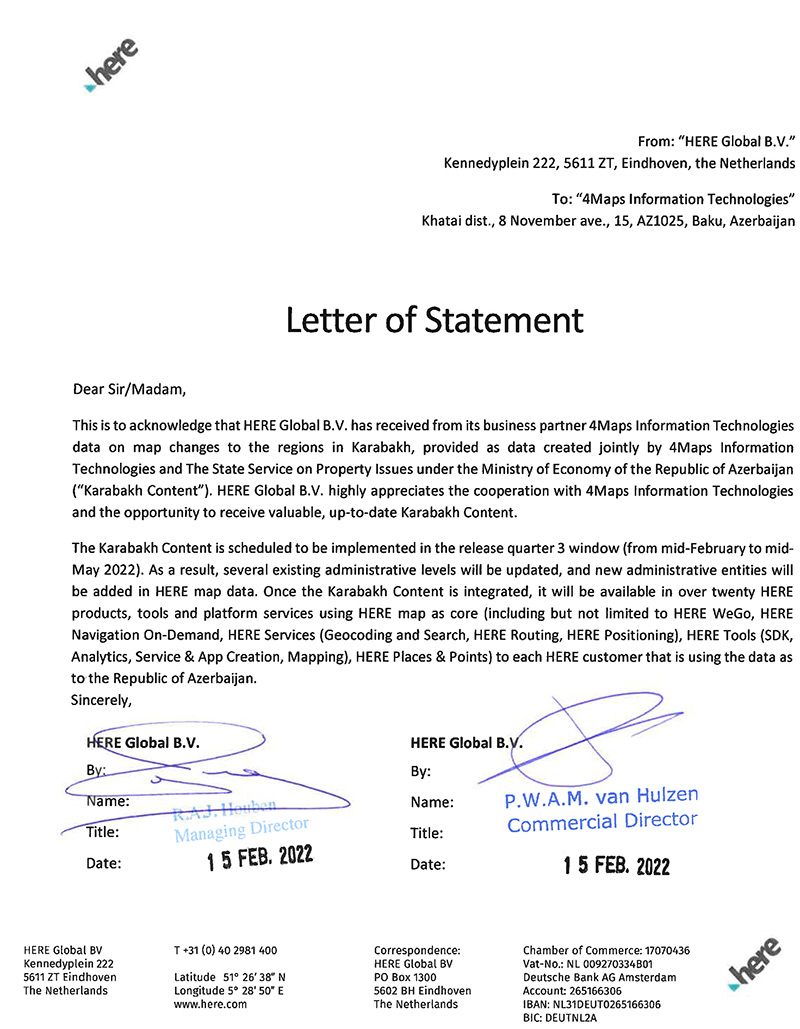 "Bununla bəyan etmək istəyirik ki, “HERE Global B.V.” şirkəti biznes tərəfdaşı “4Maps İnformasiya Texnologiyaları” şirkətindən “4Maps İnformasiya Texnologiyaları” və “Azərbaycan Respublikasının İqtisadiyyat Nazirliyi yanında Əmlak Məsələləri Dövlət Xidməti” tərəfindən birgə yaradılmış Azərbaycan Respublikasının vahid parçası olan Qarabağ regionu üzrə xəritə dəyişikliklərini özündə əhatə edən data məlumatlarını qəbul edib (məktubda “Qarabağ Xəritə Məlumatları” olaraq istinad ediləcək).