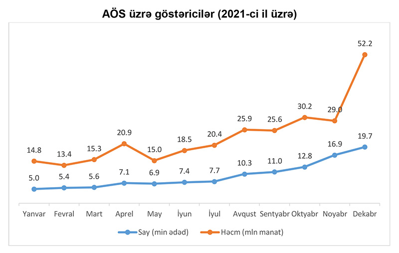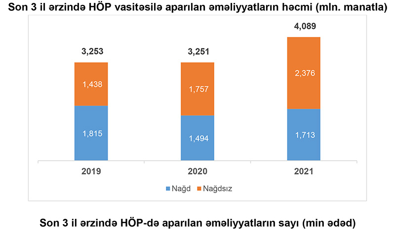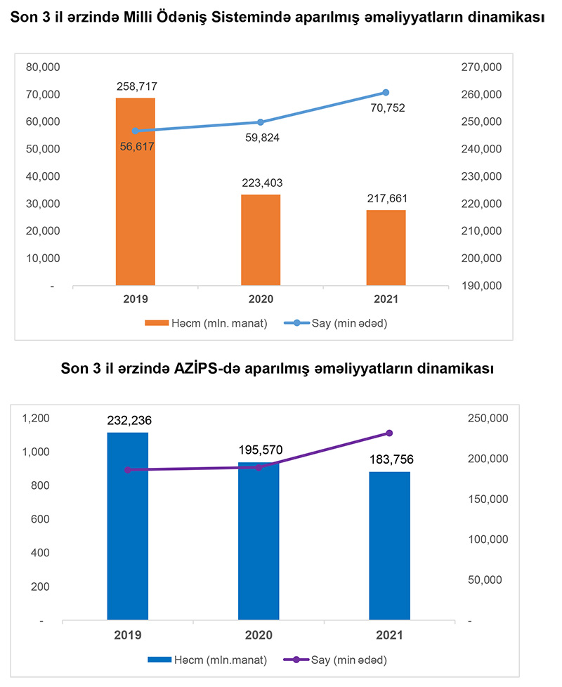2021-ci il ərzində ölkədə Milli Ödəniş Sistemi (AZİPS, XÖHKS) vasitəsilə aparılan əməliyyatların ümumi həcmi 217.7 mlrd. manat, sayı isə 70.8 mln. ədəd təşkil etmişdir.