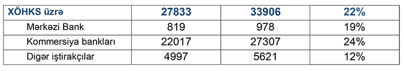 Marja Mərkəzi Bankın hesabatına istinadən xəbər verir ki, hesabat dövrü ərzində Milli Ödəniş Sisteminin əsas komponentləri olan iri və təcili ödənişlər üzrə “Real Vaxt Rejimində Banklararası Hesablaşmalar Sistemi” (AZİPS) üzrə keçən 4 ödənişlərin sayı 1.1 mln. ədəd, həcmi 183.8 mlrd. manat, xırda və daim təkrarlanan ödənişlərin elektron daşıyıcılarla həyata keçirilməsinə imkan verən “Xırda Ödənişlər üzrə Hesablaşma Klirinq Sistemi” (XÖHKS) üzrə isə ödənişlərin sayı 69.6 mln. ədəd, həcmi 33.9 mlrd. manat olmuşdur.