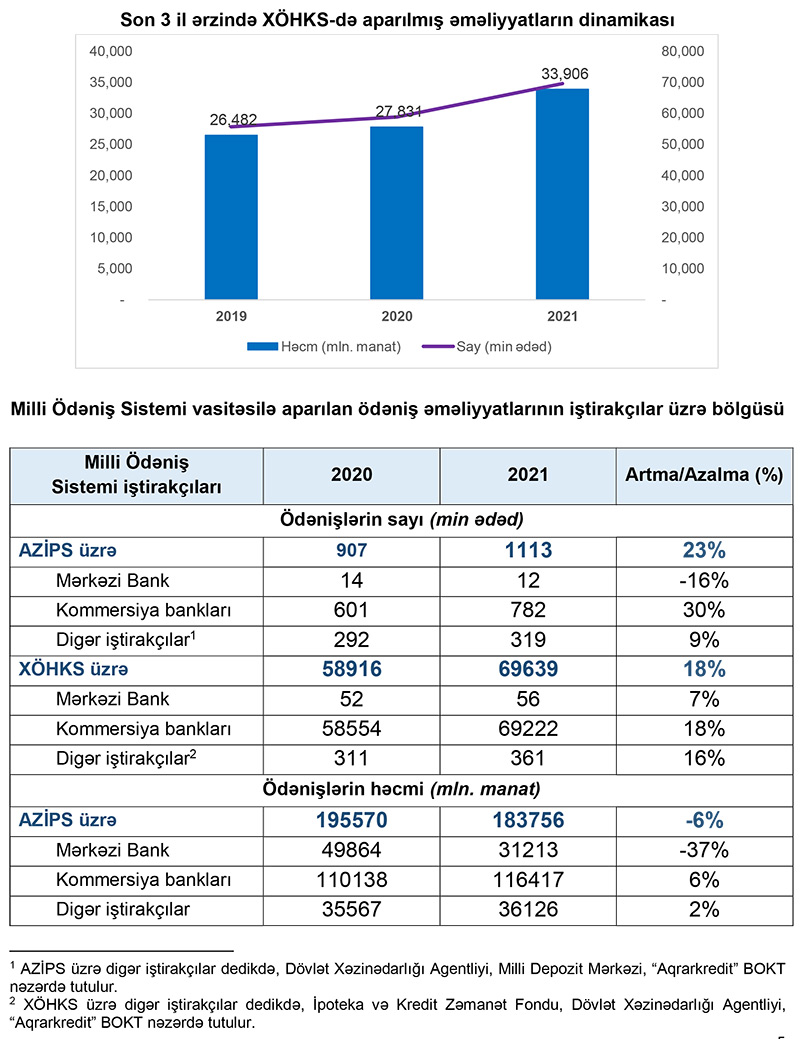 2020-ci il ilə müqayisədə aparılan əməliyyatların sayında AZİPS üzrə 22.8%, XÖHKS üzrə isə 18.2% artım olmuşdur. Milli Ödəniş Sistemi vasitəsilə kommersiya bankları tərəfindən aparılmış köçürmələrin sayı və həcmi 2020-ci illə müqayisədə müvafiq olaraq 18.3% və 8.6% artmışdır.
