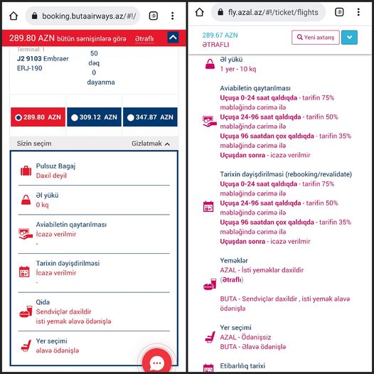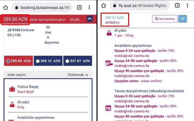 Biletlərin qiymətini müqayisə etmək üçün biz də adıçəkilən hava yollarının saytında bilet axtardıq və eyni mənzərənin şahidi olduq. Fevralın 23-ü tarixinə eyni istiqamətə 23 kq baqaj daxil bilet AZAL-la 297.40, “Buta” ilə isə 318.80 AZN-ə göstərir.