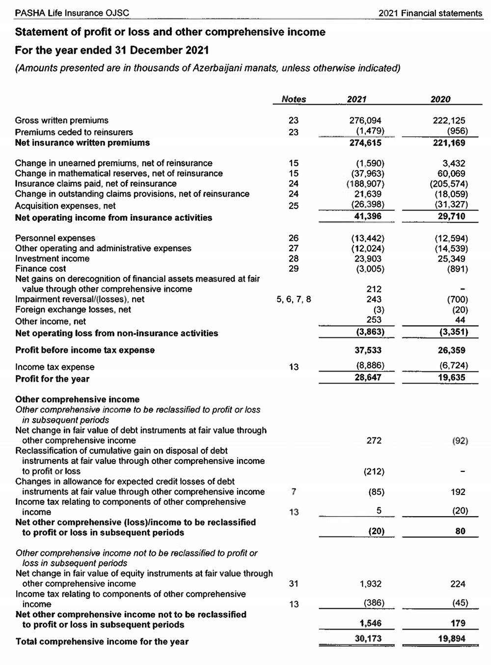 PAŞA Həyat 2021-ci ili 28 milyon 647 min manat xalis mənfəət ilə başa vurub. 2020-ci illə müqayisədə Şirkətin xalis mənfəti 46% artıb.