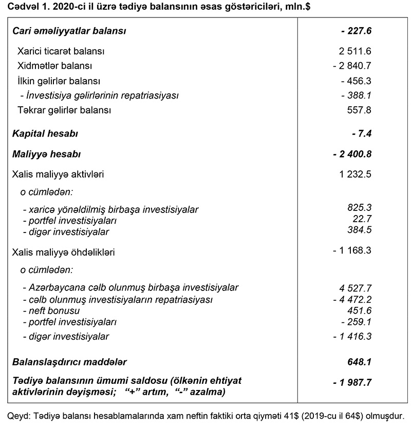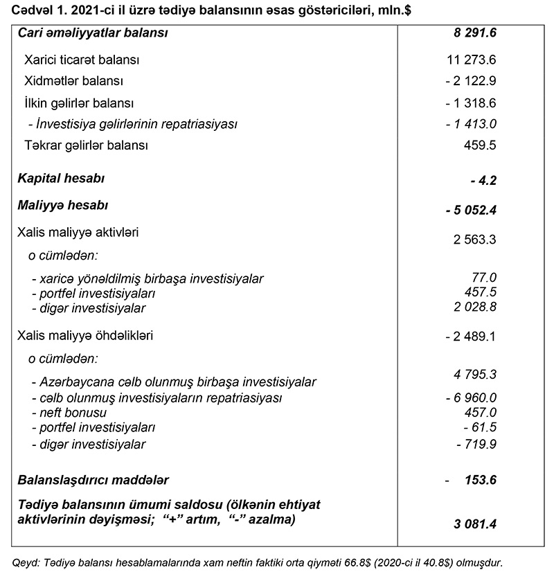 Azərbaycan Mərkəzi Bankı 2021-ci ildə tədiyə balansını açıqlayıb.