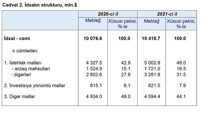 2021-ci il üzrəəmtəə idxalı ö.i.n. 3.4% artaraq 10.4 mlrd.$ təşkil etmişdir, o cümlədən istehlak mallarının idxalının ümumi dəyəri isə 5 mlrd.$ olmuş, bunun da 1.7 mlrd.$-ı ərzaq məhsullarının payına düşür. Qeyri-neft sektoru üzrə idxal 7.2% artaraq 8.8 mlrd.$ olmuşdur. Qeyri-neft idxalının strukturunda minik avtomobillərinin (2.7 dəfə), portativ hesablama maşınlarının (64,6%), yük avtomobillərinin (59.4%), şəkərin (42.6%), əczaçılıq məhsullarının (40.1%), ətir və kosmetik vasitələrinin (36%), alkoqollu və alkoqolsuz içkilərinin (27.2%), ağac məmulatlarının (25.5%), mebel məhsullarının (23.7%), daş və şüşə məmulatlarının (22.1%), palma yağının (12.8%), tərəvəz məhsullarının (10.5%), kağız məmulatlarının (8.6%), dənli bitkilərin (7.8%), metalların (6.5%) və tütün məhsullarının (6.3%) idxalı artmış, uçuş aparatlarının (9.9 dəfə), dəmiryol nəqliyyat vasitələrinin (38.6%), rabitə qurğularının (14,1%), kərə yağının (3.5%), gəmilər, qayıqlar və üzən konstruksiyaların (3.3%), sabun və yuyucu vasitələrin (2.9%) idxalı isə azalmışdır.