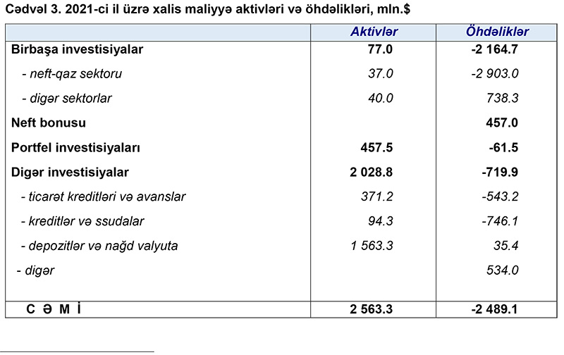 2021-ci il üzrə ölkənin xalis maliyyə aktivləri 2 563.3 mln.$ artmışdır. Bu göstərici xaricə yönəldilmiş birbaşa investisiyalar (77.0 mln.$), portfel investisiyaları (457.5 mln.$) və digər investisiyalar (2 028.8 mln.$) hesabına formalaşmışdır. Hesabat dövründə ölkənin xalis maliyyə öhdəlikləri isə 2 489.1 mln.$ azalmışdır ki, bu da xaricdən cəlb olunmuş xalis birbaşa investisiyalar (-2 164.7 mln.$), neft bonusu (457.0 mln.$), portfel investisiyaları (-61.5 mln.$) və digər investisiyalar (-719.9 mln.$) hesabına formalaşmışdır.