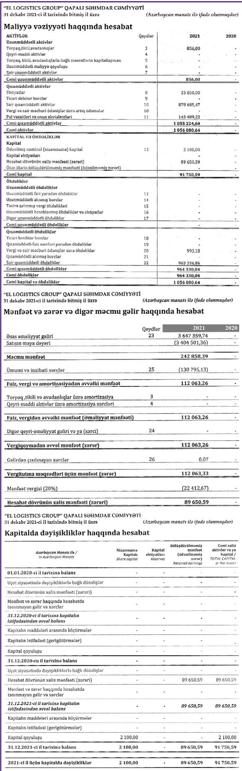 31 Dekabr 2021-ci il tarixində “EL Logistics Group” 1 milyon 56 min manat cəmi aktivlərə, 964 min manat cəmi öhdəliklərə və 92 min manat cəmi kapitala malik olub.
