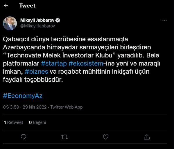 "Belə platformalar startap ekosisteminə yeni və maraqlı imkan, biznes və rəqabət mühitinin inkişafı üçün faydalı təşəbbüsdür",- nazir qeyd edib.