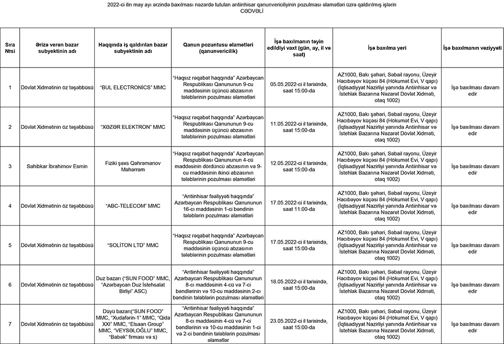 Marja.az Xidmətə istinadən xəbər verir ki, araşdırma zamanı “SUN FOOD” MMC, “Xudafərin-1” MMC, “Qida XXI” MMC, “Elsaan Group” MMC, “VEYSƏLOĞLU” MMC, “Babək” firması və s tərəfindən antiinhisar qanunvericiyilinin pozulması əlamətləri aşkar olunaraq həmin təsərrüfat subyektləri barədə iş qaldırılıb.