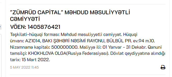 15 Mart 2022-ci il tarixində Dövlət Vergi Xidməti "ZÜMRÜD CAPİTAL" MMC-ni dövlət qeydiyyatına alıb.