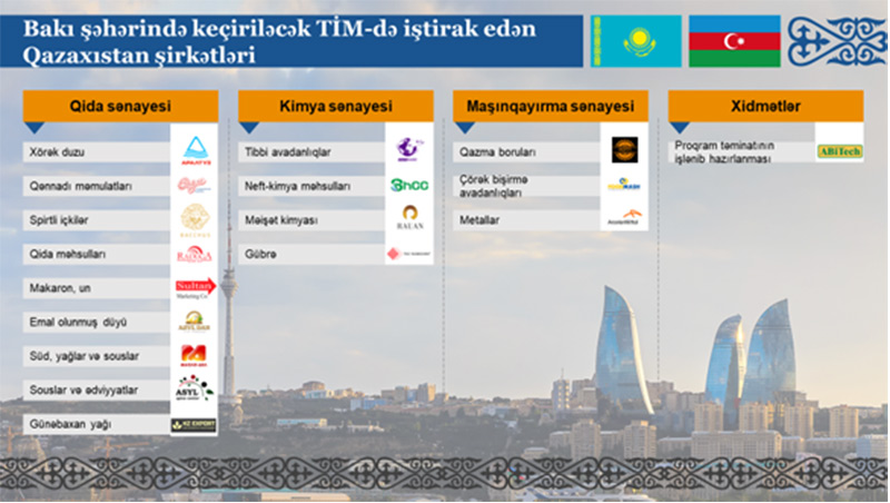 Qazaxıstan nümayəndə heyətinə “QazTrade” SC tərəfindən həyata keçirilən “İxracın Sürətləndirilməsi Proqramında” iştirak edən şirkətlər daxildir. Artıq üçüncü ildir ki, Proqram Azərbaycan bazarı daxil olmaqla, Qazaxıstan ixracatçıları üçün geniş yayılmış dövlət dəstəyi vasitələrindən biridir. İştirakçılar arasında Qazaxıstanın İT və tikinti sektorunun nümayəndələri, ət-süd, un və qənnadı məmulatları istehsalçıları və metal konstruksiyalar istehsalı şirkətləri yer alır.
