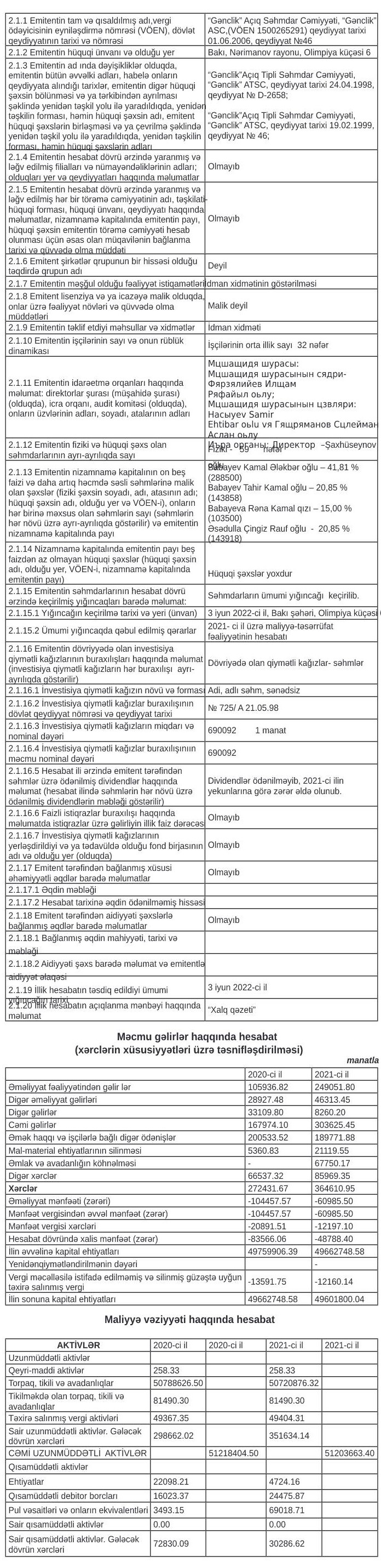 İdman-sağlamlıq kompleksini idarə edən "Gənclik" ASC 2021-ci ili 48 min 788 manat xalis zərər ilə başa vurub. Şirkət 2020-ci ili 83 min 566 manat xalis zərər ilə bağlamışdı.