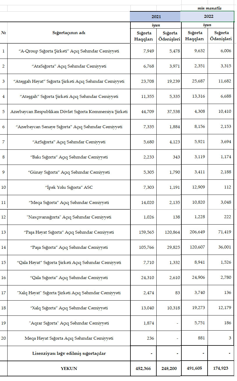 2022-ci ilin birinci yarısında (yanvar-iyun) Azərbaycanın sığorta şirkətləri tərəfindən 491 milyon 605 min manat sığorta haqları hesablanıb.