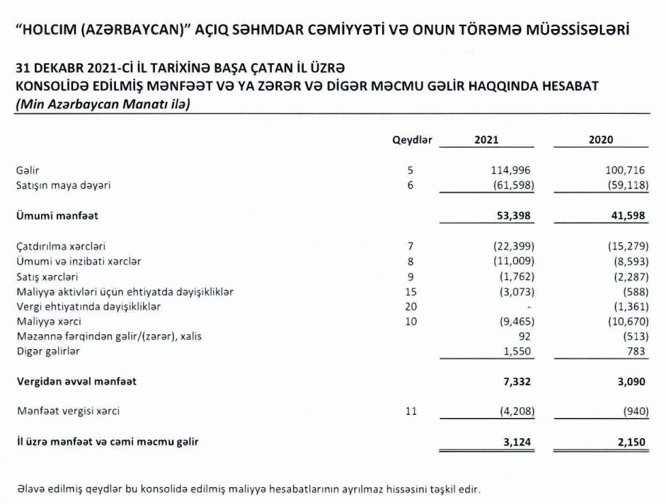 Marja.az xəbər verir ki, 2021-ci ildə "Norm" ASC 170 milyon 864 min manatlıq sement məhsullarının çatdırılmasına 11 milyon 965 min manat xərc çəkib. Ötən il "Holcim Azərbaycan" ASC isə 114 milyon 996 min manatlıq məhsulların çatdırımasına 22 milyon 399 min manat xərcləyib.