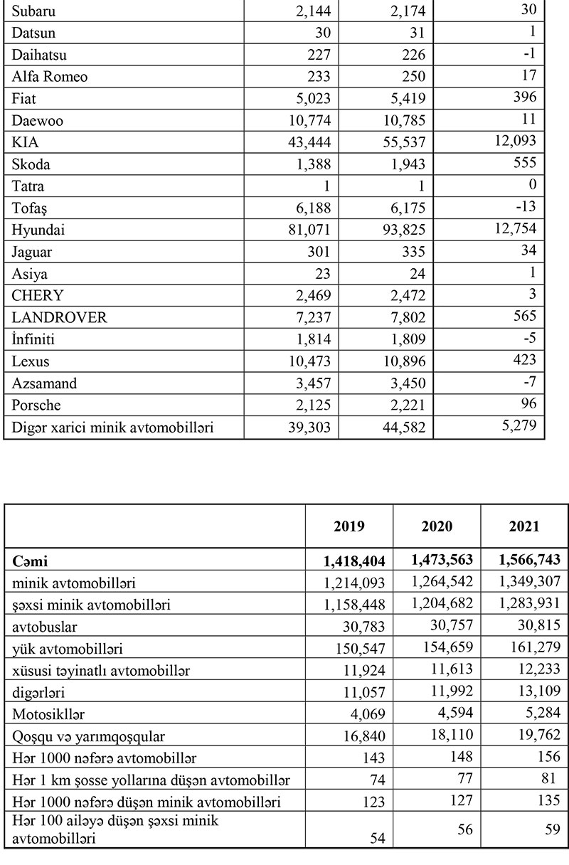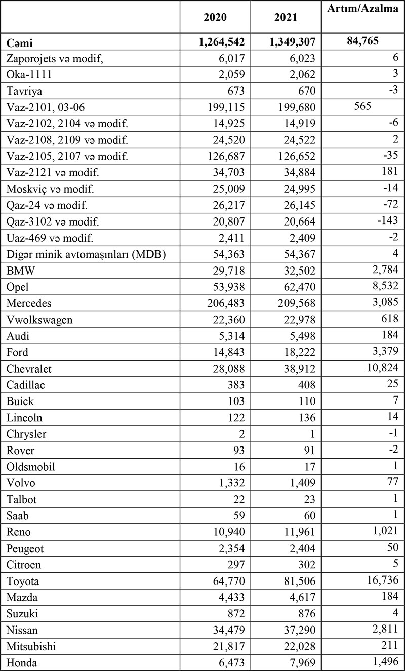 2021-ci ildə Azərbaycanda ən çox Toyota (+16 min 736), Hyundai (+12 min 754), KİA (+12 min 93), Chevrolet (+10 min 824) və Opel (+8, min 532) markalı avtomobillər artıb.