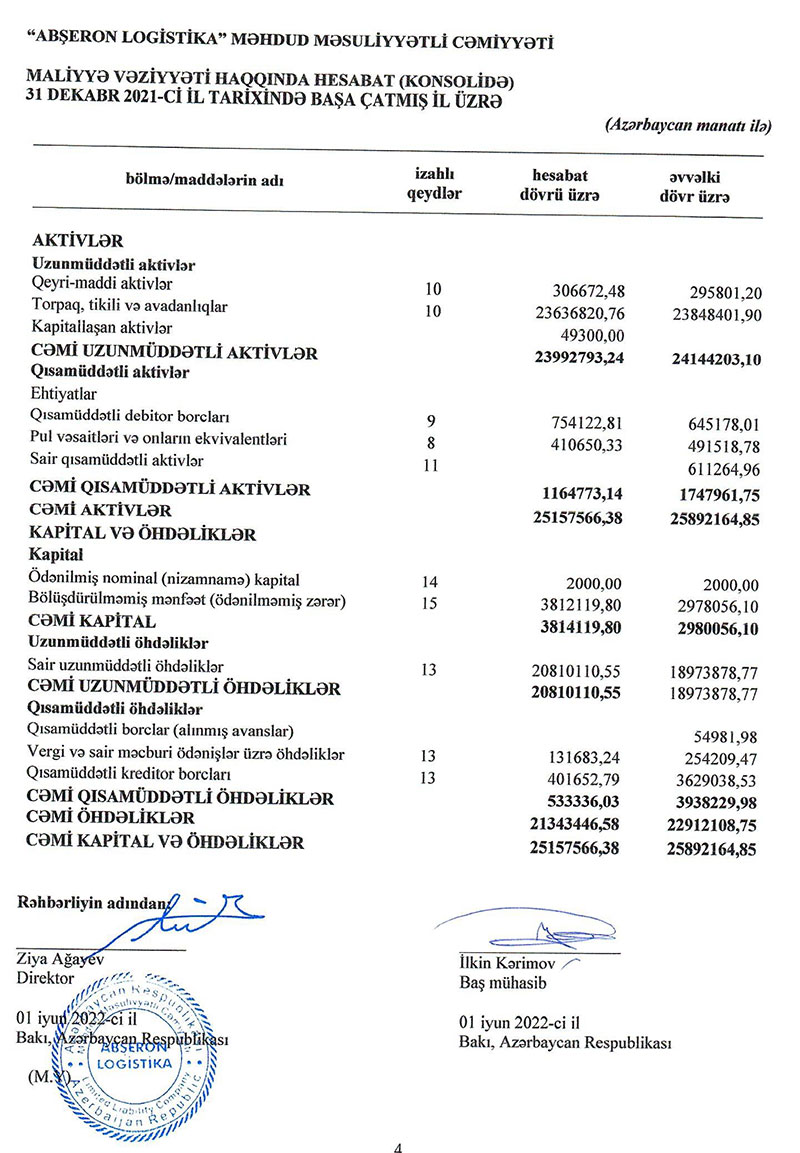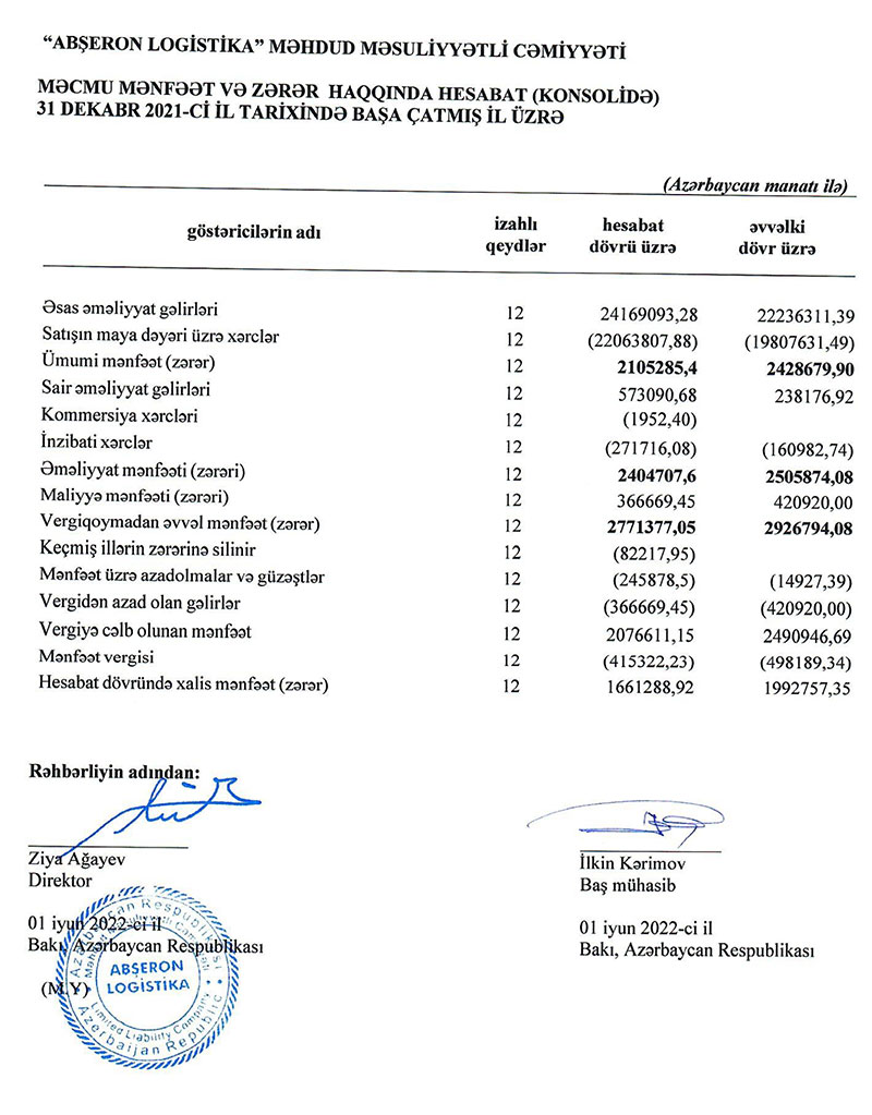"Abşeron Logistika" MMC 2021-ci ili 1 milyon 661 min manat xalis mənfəət ilə başa vurub. Şirkət 2020-ci ili 1 milyon 993 min manat xalis mənfəət ilə bağlamışdı.