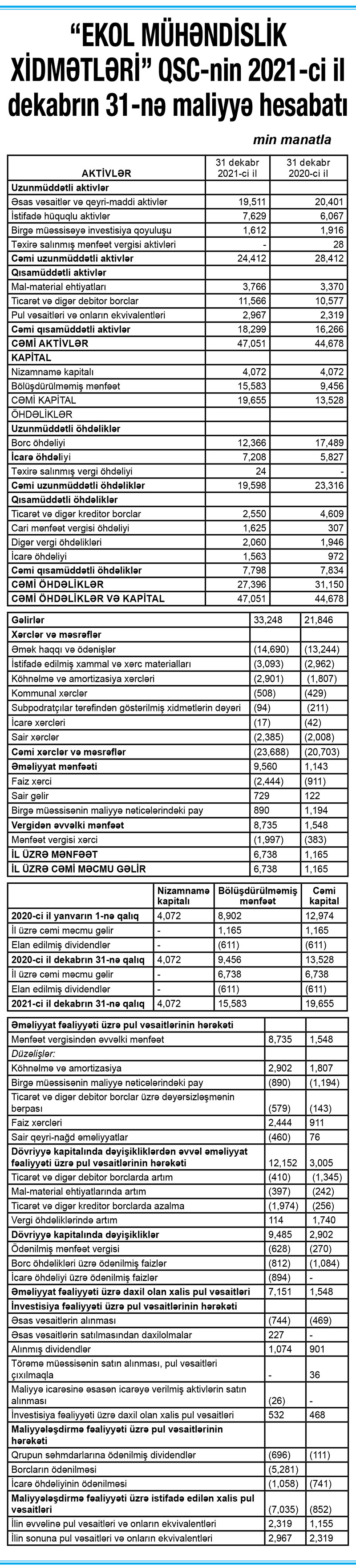 "Ekol Mühəndislik Xidmətləri" QSC (EKOL) 2021-ci ili 6 milyon 738 min manat xalis mənfəət ilə başa vurub. Halbuki, QSC 2020-ci ili 1 milyon 165 min manat xalis mənfəət ilə bağlamışdı. Beləliklə, "Ekol Mühəndislik Xidmətləri"nin xalis mənfəəti 2020-ci illə müqayisədə 2021-ci ildə 5,8 dəfə artıb.
