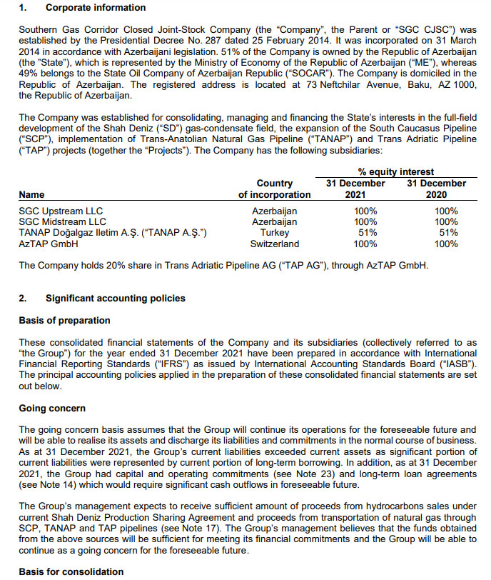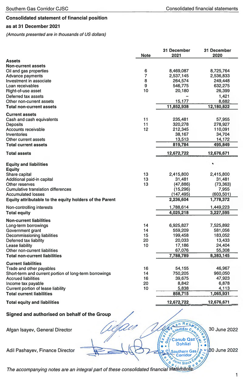 31 Dekabr 2021-ci il tarixində "Cənub Qaz Dəhlizi" QSC 12 milyard 672 milyon 722 min manat cəmi aktivlərə və 24 nəfər işçiyə malik olub.