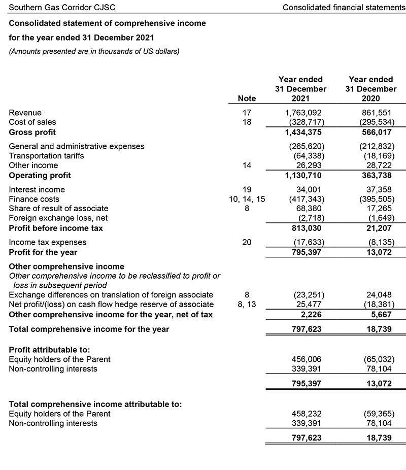 "Cənub Qaz Dəhlizi" QSC 2021-ci ili 795 milyon 397 min manat xalis mənfəət ilə başa vurub. Halbuki, şirkət 2020-ci ili 13 milyon 72 min manat xalis mənfəət ilə bağlamışdı. Beləliklə, 2020-ci illə müqayisədə 2021-ci ildə QSC-nin xalis mənfəəti təxminən 61 dəfə artıb. Artım gəlirlərin artmasından qaynaqlanır.