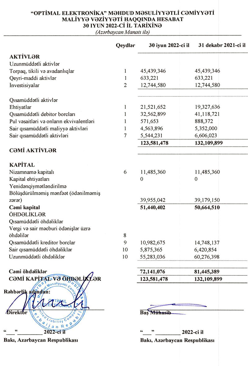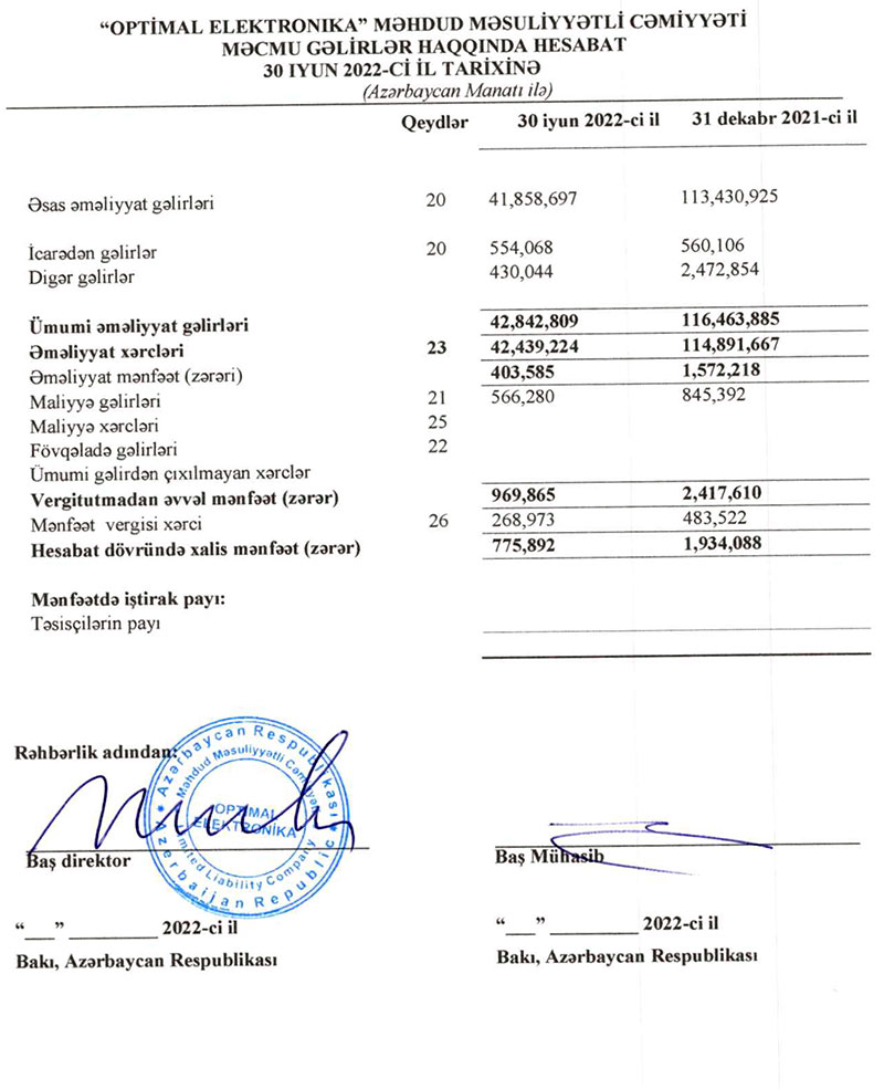 "Optimal Elektronika" MMC 2022-ci ilin birinci yarısını (yanvar-iyun) 776 min manat xalis mənfəət ilə başa vurub. Xatırladaq ki, Şirkət 2021-ci ili 1 milyon 934 min manat xalis mənfəət ilə bağlamışdı.